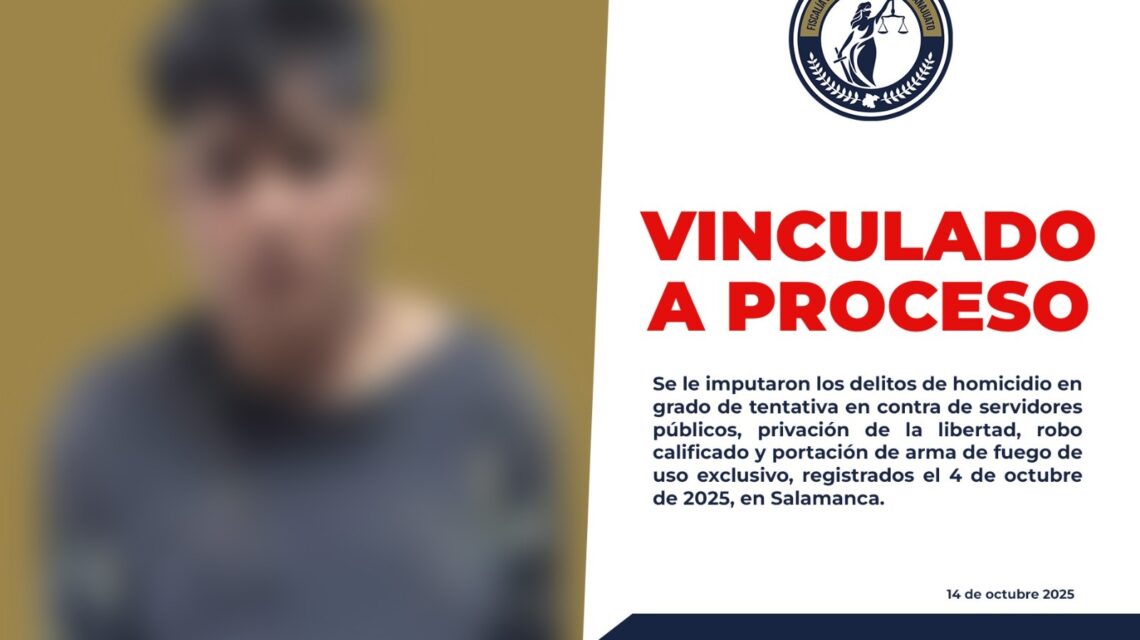 Salamanca, Gto., a 15 de octubre del 2025.- La Fiscalía General del Estado (FGEG) informó que un juez vinculó a proceso penal a Óscar Gabriel “N” por los delitos de homicidio en grado de tentativa contra servidores públicos, privación ilegal de la libertad agravada, robo calificado y portación de arma de fuego.