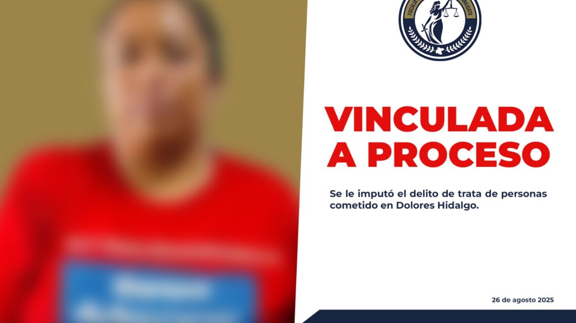 Dolores Hidalgo C.I.N., Gto., a 26 de agosto del 2025.- La Fiscalía General del Estado de Guanajuato obtuvo la vinculación a proceso penal de Sandra Marisela “N”, de 36 años, por su probable participación en el delito de trata de personas en la modalidad de prostitución ajena, en hechos registrados en el municipio de Dolores Hidalgo.