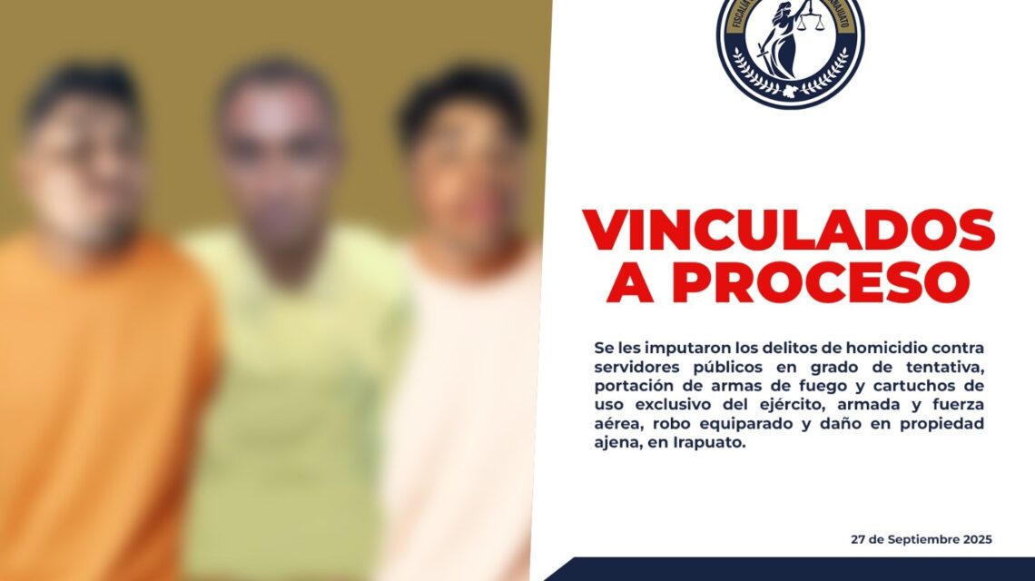 Irapuato, Gto., a 27 de septiembre del 2025.- La Fiscalía General del Estado de Guanajuato (FGEG) informó que tres hombres fueron vinculados a proceso tras protagonizar un violento enfrentamiento contra fuerzas de seguridad estatales y federales en Irapuato.