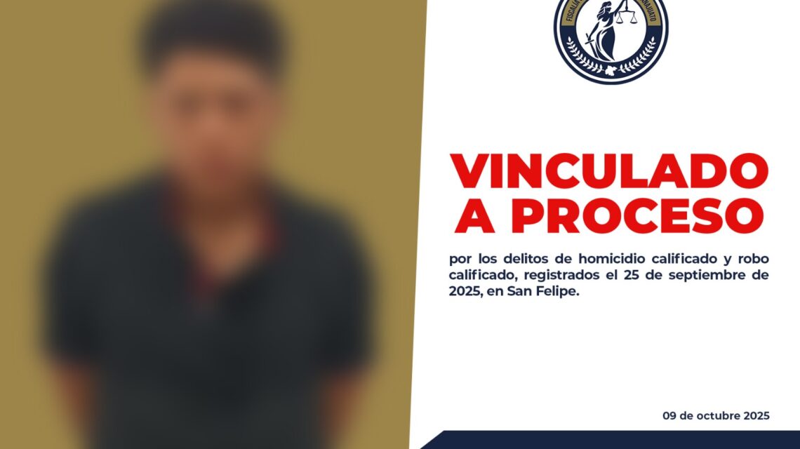 San Felipe, Gto., a 09 de octubre del 2025.- La Fiscalía General del Estado de Guanajuato (FGE) informó que un Juez de Control dictó auto de vinculación a proceso en contra de Luis Armando “N”, señalado por su presunta participación en el homicidio de Juan Alberto “N”, quien se desempeñaba como Jefe de Unidad dentro de la institución. El hecho ocurrió el 25 de septiembre de 2025.