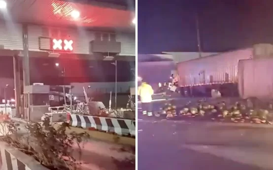 Un tráiler se impactó contra dos casetas de cobro en la autopista México-Querétaro, en Tepotzotlán, luego de un presunto asalto al conductor. Autoridades investigan.