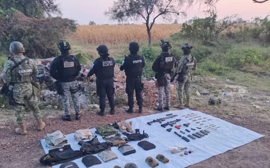 Autoridades estatales y federales aseguraron armas, cartuchos, equipo táctico y droga en un operativo en Churipitzeo, Pénjamo. El hallazgo se dio tras un patrullaje preventivo.